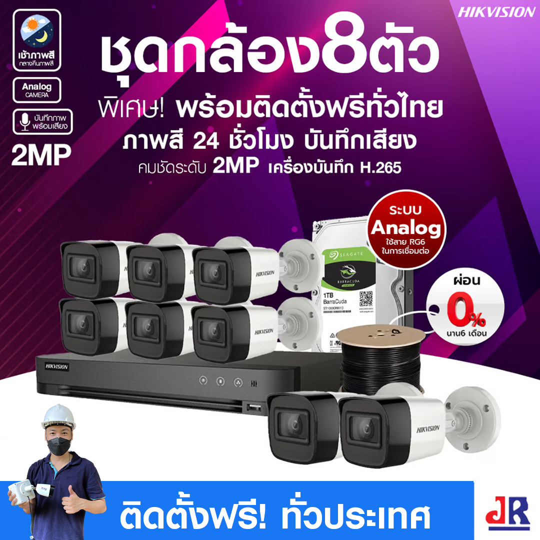 “ชุดกล้องวงจรปิดพร้อมติดตั้ง Hikvision ภาพสี 24ชั่วโมง ระบบ Analog" จำนวน 8 ตัว ความคมชัด 2MP บันทึกภาพพร้อมเสียง