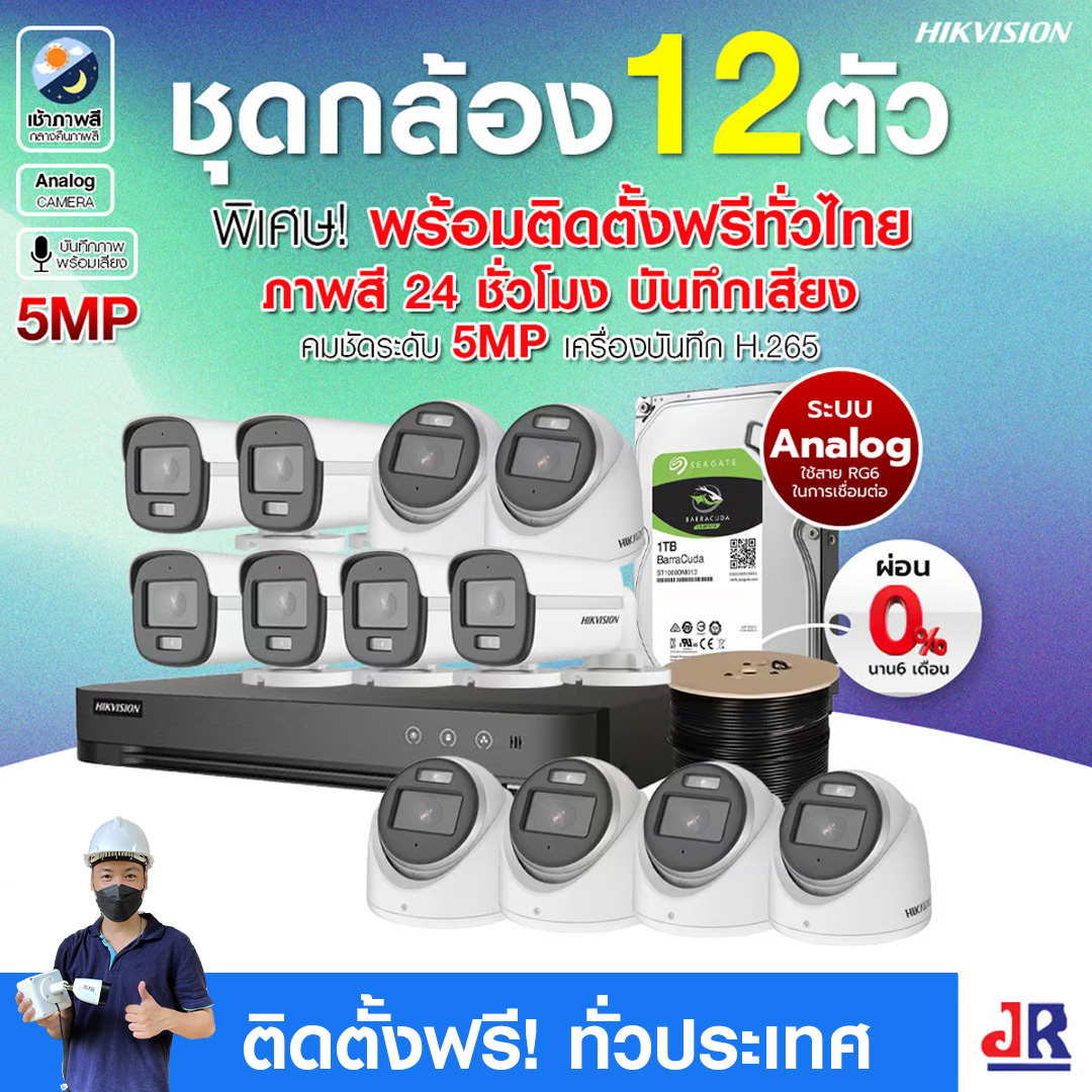 “ชุดกล้องวงจรปิดพร้อมติดตั้ง Hikvision ภาพสี 24ชั่วโมง ระบบ Analog" จำนวน 12 ตัว ความคมชัด 5MP บันทึกภาพพร้อมเสียง