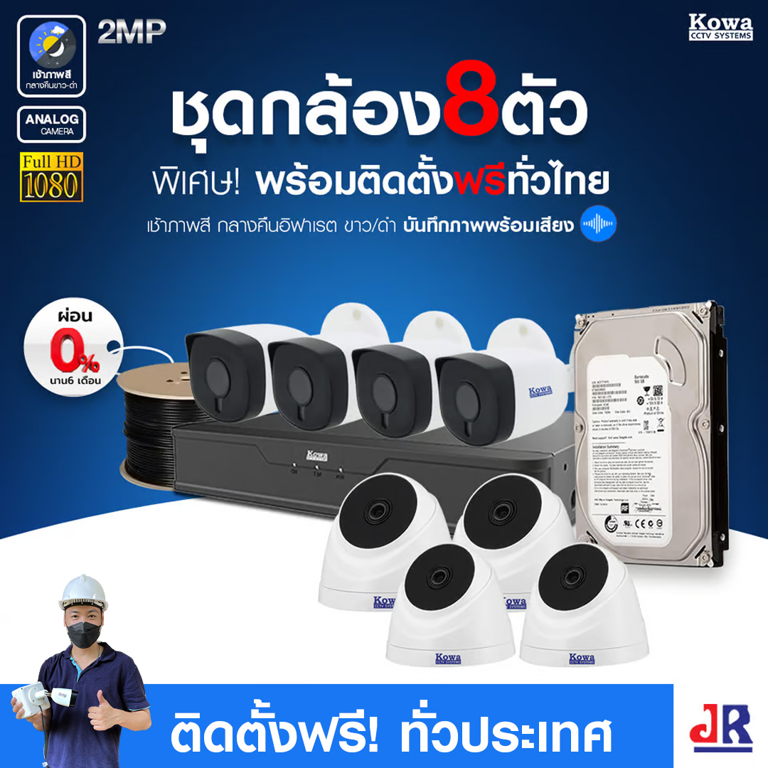 ชุดกล้องวงจรปิดพร้อมติดตั้ง KOWA ระบบ Analog จำนวน 8 ตัว ความคมชัด 2MP บันทึกภาพพร้อมเสียง สามารถดูออนไลน์ผ่าน APP  ในมือถือ ตลอด 24 ชั่วโมง