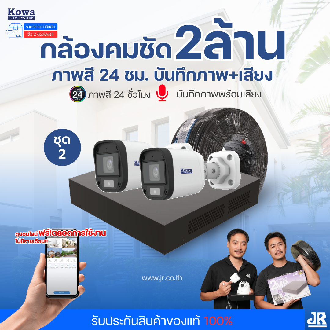 ชุดกล้องวงจรปิดพร้อมติดตั้ง KOWA ระบบ Analog จำนวน 2 ตัว ความคมชัด 2MP บันทึกภาพพร้อมเสียง สามารถดูออนไลน์ผ่าน APP ในมือถือ ตลอด 24 ชั่วโมง