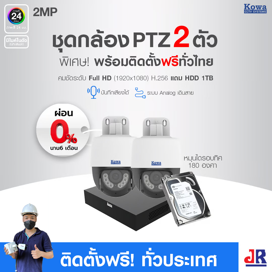 ชุดกล้องวงจรปิดพร้อมติดตั้ง KOWA PTZ หมุนได้ ระบบ Analog จำนวน 2 ตัว ความคมชัด 2MP บันทึกภาพพร้อมเสียง