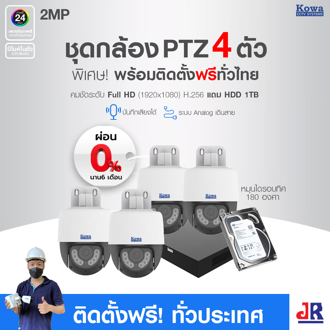 ชุดกล้องวงจรปิดพร้อมติดตั้ง KOWA PTZ หมุนได้ ระบบ Analog จำนวน 4 ตัว ความคมชัด 2MP บันทึกภาพพร้อมเสียง