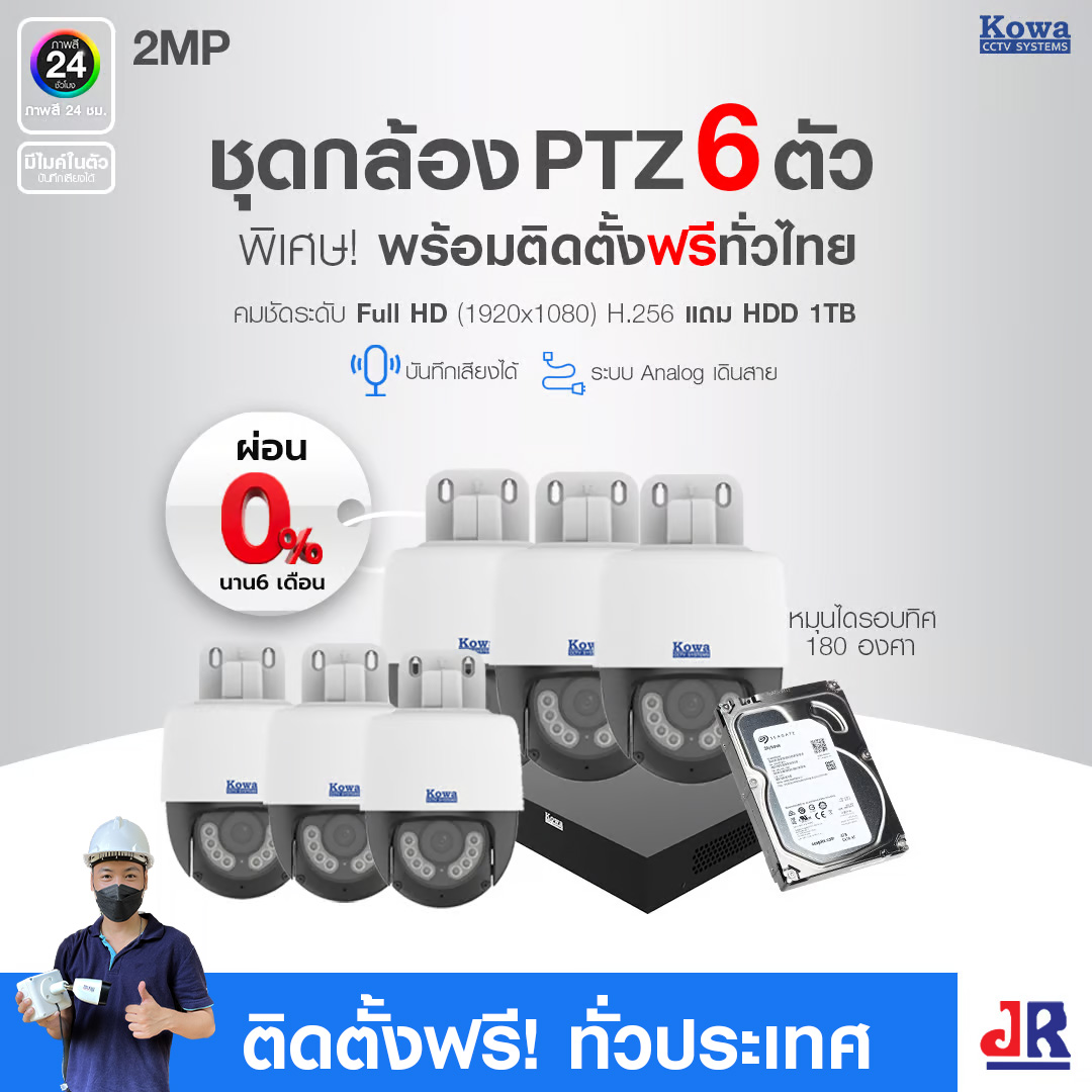 ชุดกล้องวงจรปิดพร้อมติดตั้ง KOWA PTZ หมุนได้ ระบบ Analog จำนวน 6 ตัว ความคมชัด 2MP บันทึกภาพพร้อมเสียง
